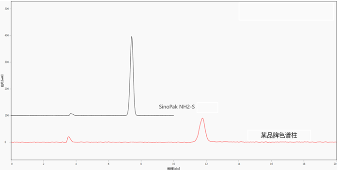 圖3. 使用SinoPak NH2-S色譜柱和某品牌氨基柱分析葡萄糖對照品的色譜圖