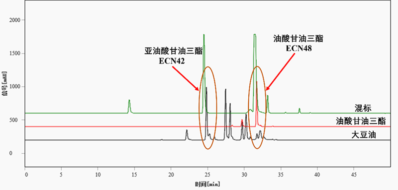 圖1. 大豆油樣品與油酸甘油三酯標(biāo)液以及甘油三酯的混標(biāo)溶液的疊加色譜圖