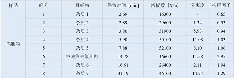使用依利特經(jīng)典SinoChrom ODS-BP色譜柱分析熊膽粉中的牛磺熊去氧膽酸,主成分與旁邊的雜質(zhì)分離度良好,可以滿足藥典定性和定量分析的需求。